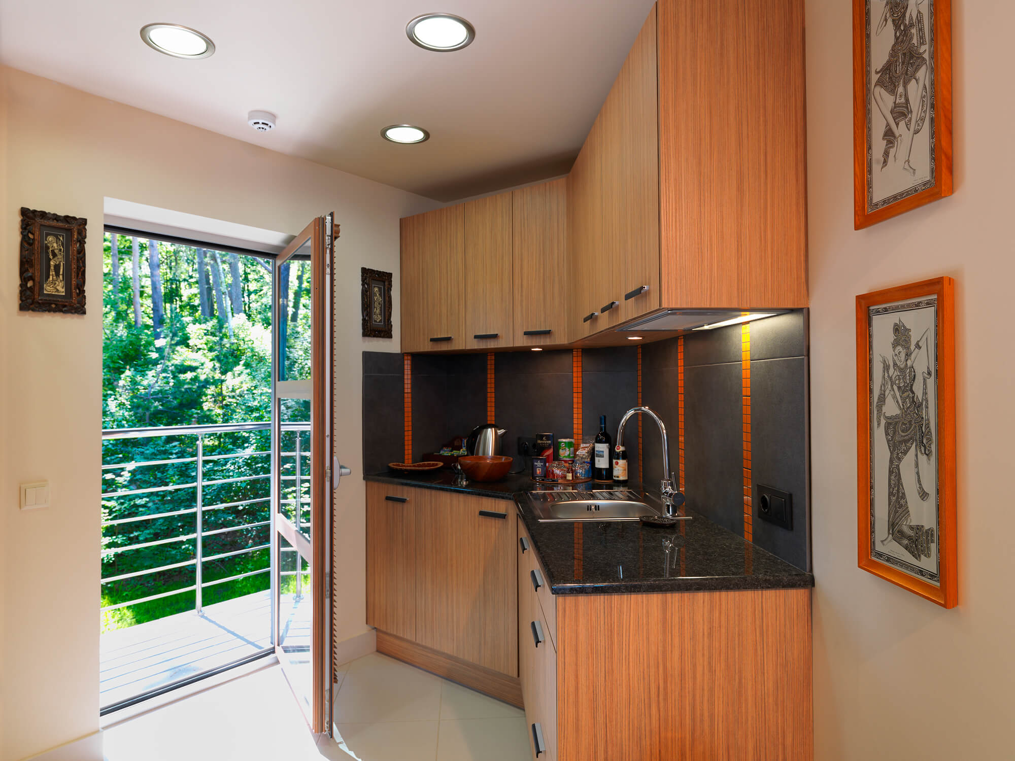 Номер «Индонезия» выполнен на контрастах. Легкая, ажурная плетеная мебель из водного гиацинта смотрится стильно, дорого и привлекательно. Яркое оранжевое покрывало напоминает жаркое южное солнце. Нежный живописный батик с изображением индонезийских красавиц на светлых стенах, индийские слоны на подушках...