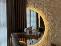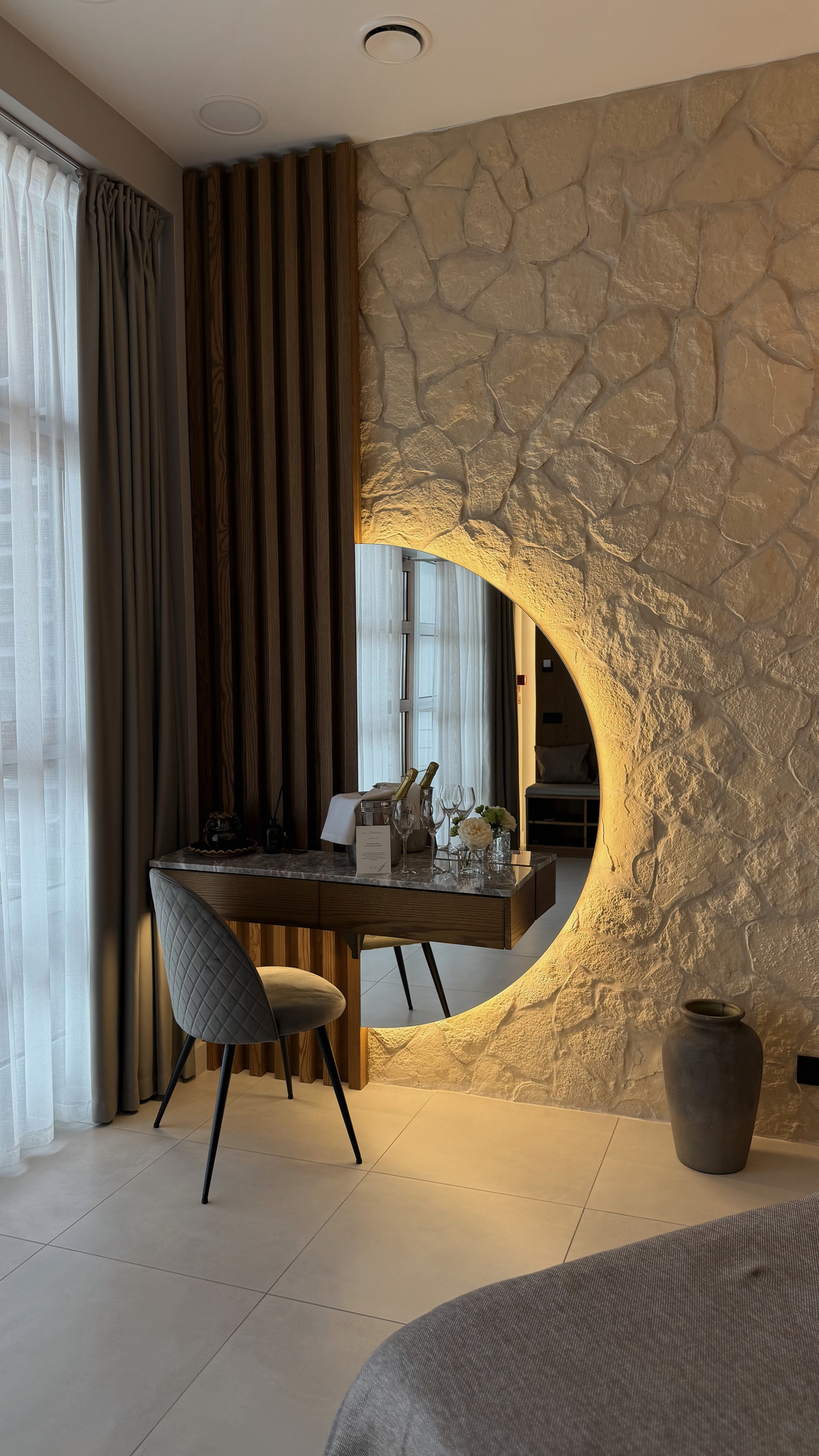 Natural materials, stone finishes, and warm wooden accents evoke the picturesque landscapes of Vidzeme. The spacious and bright interior creates ideal conditions for relaxation, with every detail of the room filled with the harmony of nature and modern comfort.