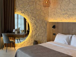 Natural materials, stone finishes, and warm wooden accents evoke the picturesque landscapes of Vidzeme. The spacious and bright interior creates ideal conditions for relaxation, with every detail of the room filled with the harmony of nature and modern comfort.